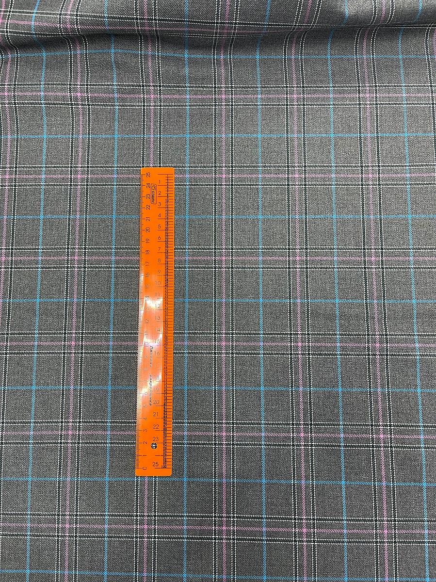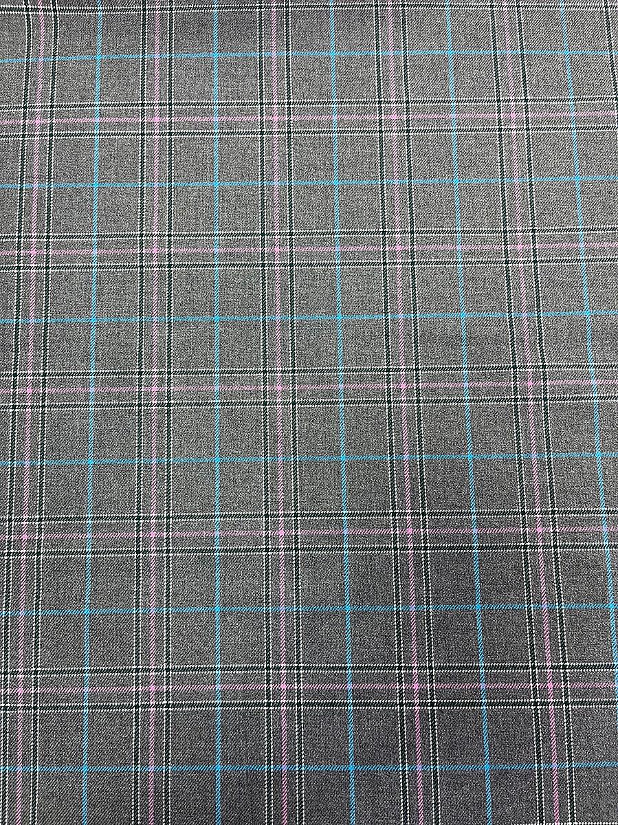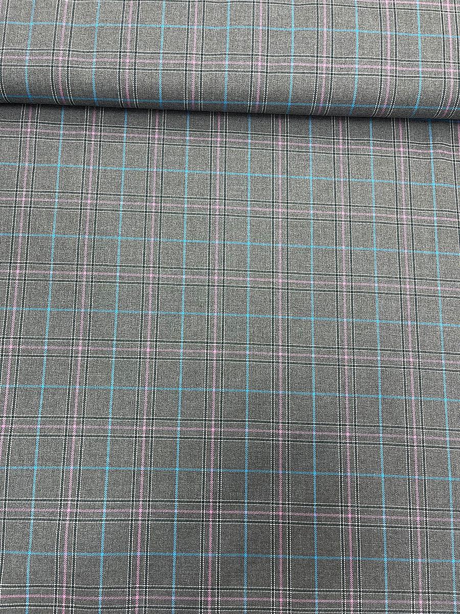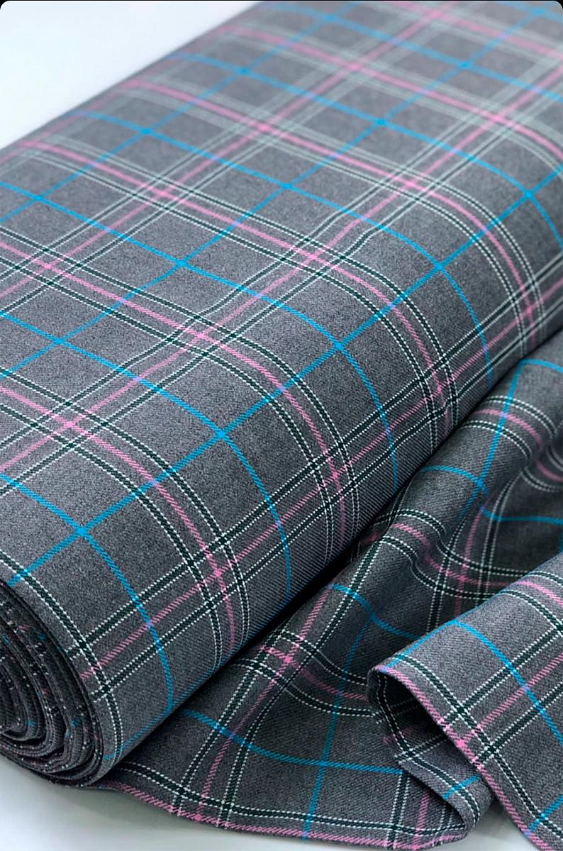 Ткань костюмная серый фон клетка розово-бирюзовая