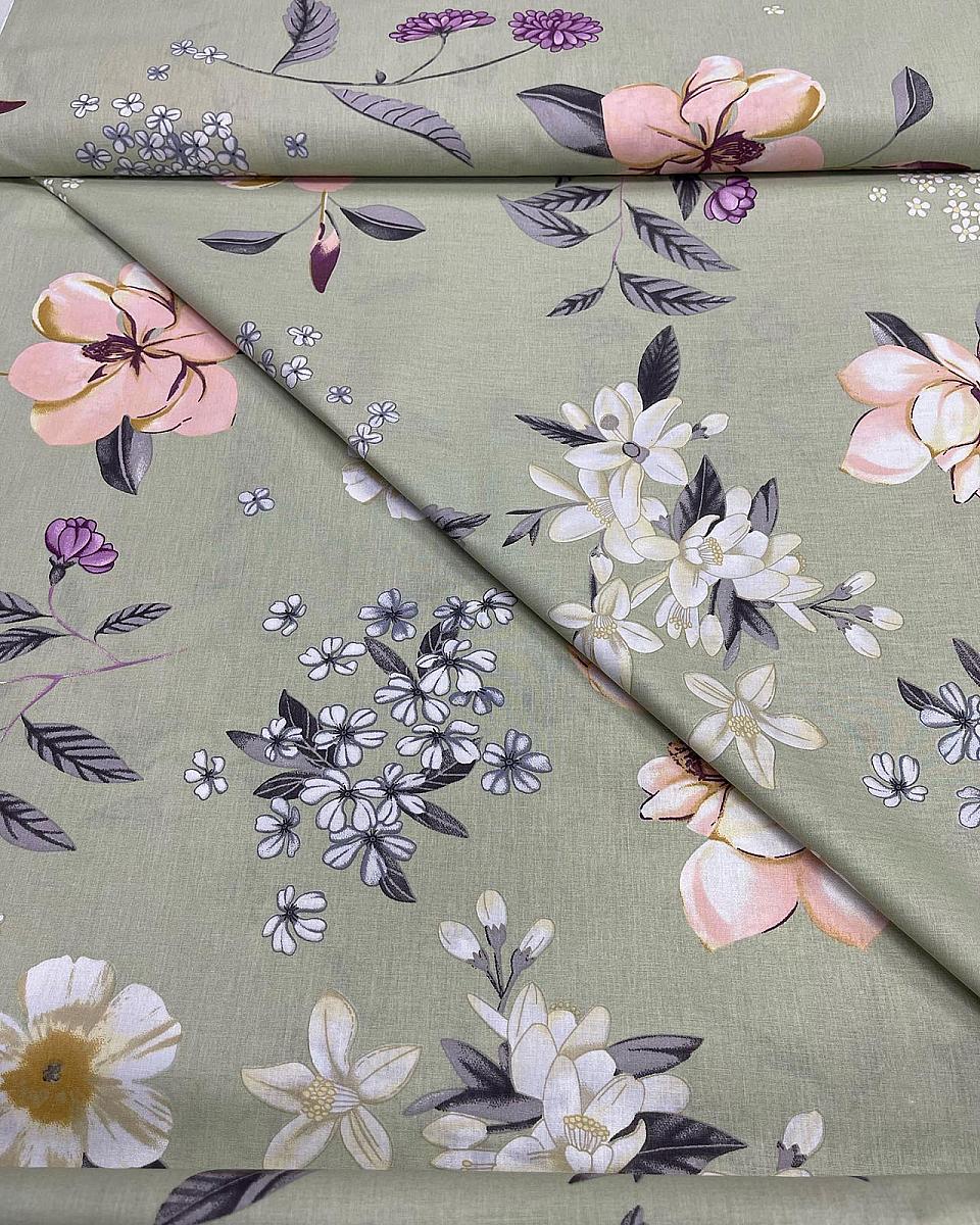 Ранфорс lux фисташковый фон магнолии персиковые,хризантемы
