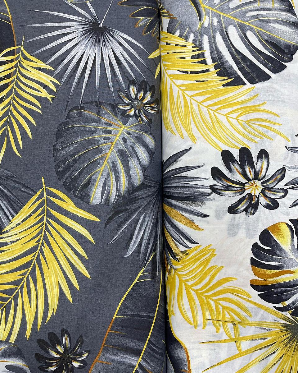 Ранфорс lux белый фон листья монстеры, папоротник черный, желтый
