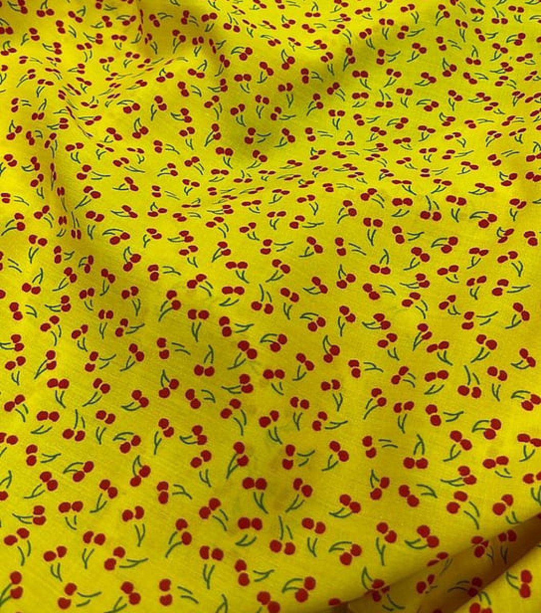Штапель-шелк желтый фон мелкие вишенки